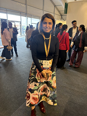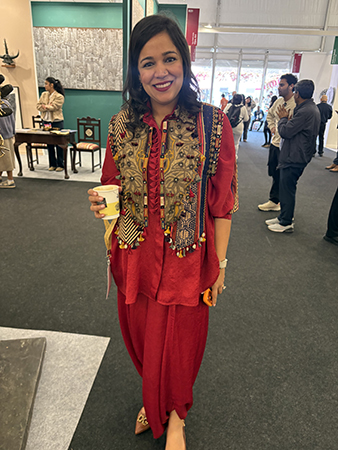 Fashion is omnipresent at IAF, Meher Kalra director Gallery Nvya, was dressed in satin dhoti pants, in vivacious crimson with a tribal yolk kurta, by Rajdeep Ranawat. “I got this from Ogaan; I wanted to feel fresh and vibrant throughout the day, and red makes me happy,” giggles Kalra.