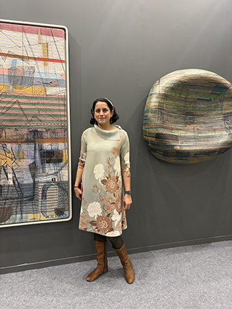 The cold didn’t seem to bother Mekhala Bahl, dressed in an olive green dress from Scarlet Sage, a brand by Sanjana Bhuwalka. She was trained at the College of Art, Delhi, and then at Rhode Island School of Design. She is a master printmaker. Her two artworks embodied a spirit of layering — the first one ‘Pressed’ took her over a year-and-a-half to create- think thread embroidered on to silk, then etching and engraving.