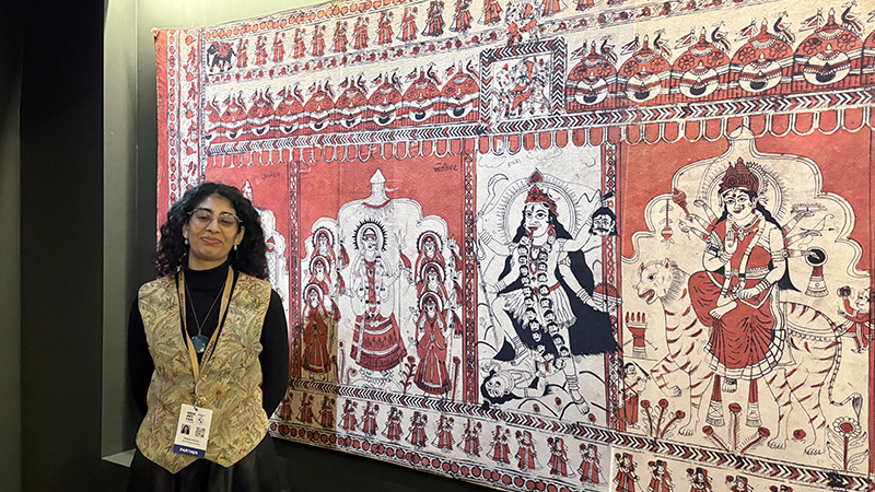 What caught my eye was the Matani Pachedi textile from Gujarat made by the Vagharis community – nomads who resided by Sabarmati river in Gujarat. Vagharis were outcasts but wanted to worship, so the 300-year-old sacred textile art worships the Khodiyar Mata, and is handpainted. Mata is riding her crocodile vahana (vehicle), involves a laborious process, de-starching, treating it with a solution of harda (terminalia chebula), a step-by-step process using madder for reds, jaggery and iron nails. “If you see closely Kaal Bharav is also depicted,” says Preksha, senior archivist Sarita Handa.