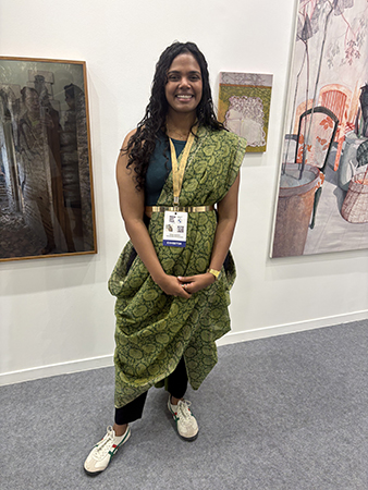 This art curator, Wendy Coutinho from Galley Vida, wore a cotton sari she bought for her graduation ceremony at JJ School of Art, Mumbai, for Rs. 1,800. She teamed it up with a cropped top, kamarband, and Onitsuka Tiger sneakers. “My classic Casio gold watch is the accessory I can’t do without,” she chuckles, adding the sari is the first one she bought from her own money from Borivali, Mumbai.