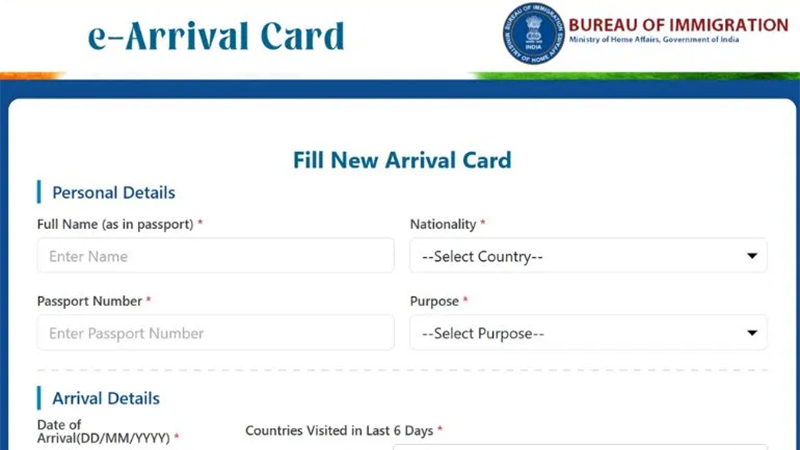 The e-Arrival Card system requires personal information such as name of traveller, travel dates, and duration and place of stay in India along with the contact information.